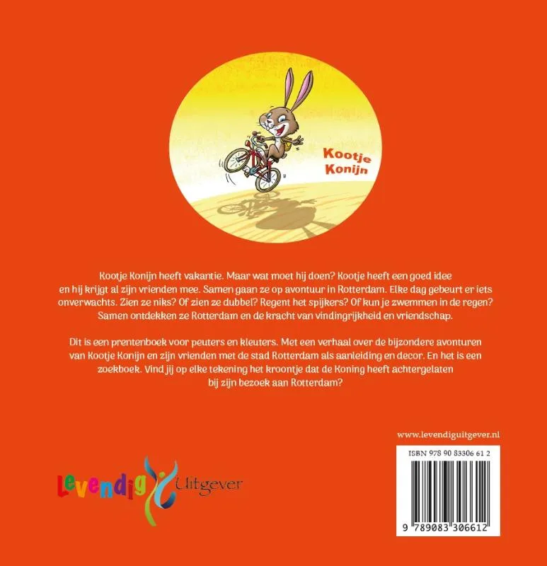 Dit is een prentenboek voor peuters en kleuters. Met een verhaal over de bijzondere avonturen van Kootje Konijn en zijn vrienden met de stad Rotterdam als aanleiding en decor. En het is een zoekboek. Vind jij op elke tekening het kroontje dat de Koning heeft achtergelaten bij zijn bezoek aan Rotterdam?