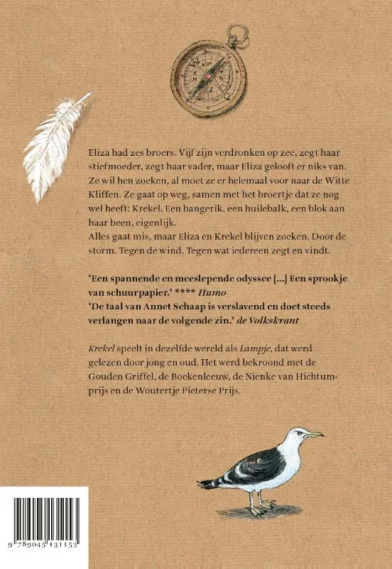 Eliza had zes broers. Vijf zijn verdronken op zee, zegt haar stiefmoeder, zegt haar vader. Maar Eliza gelooft er niks van. Ze wil hen zoeken, al moet ze er helemaal voor naar de Witte Kliffen. Ze gaat op weg, samen met het broertje dat ze nog wel heeft: Krekel. Een bangerik, een huilebalk, een blok aan haar been, eigenlijk.