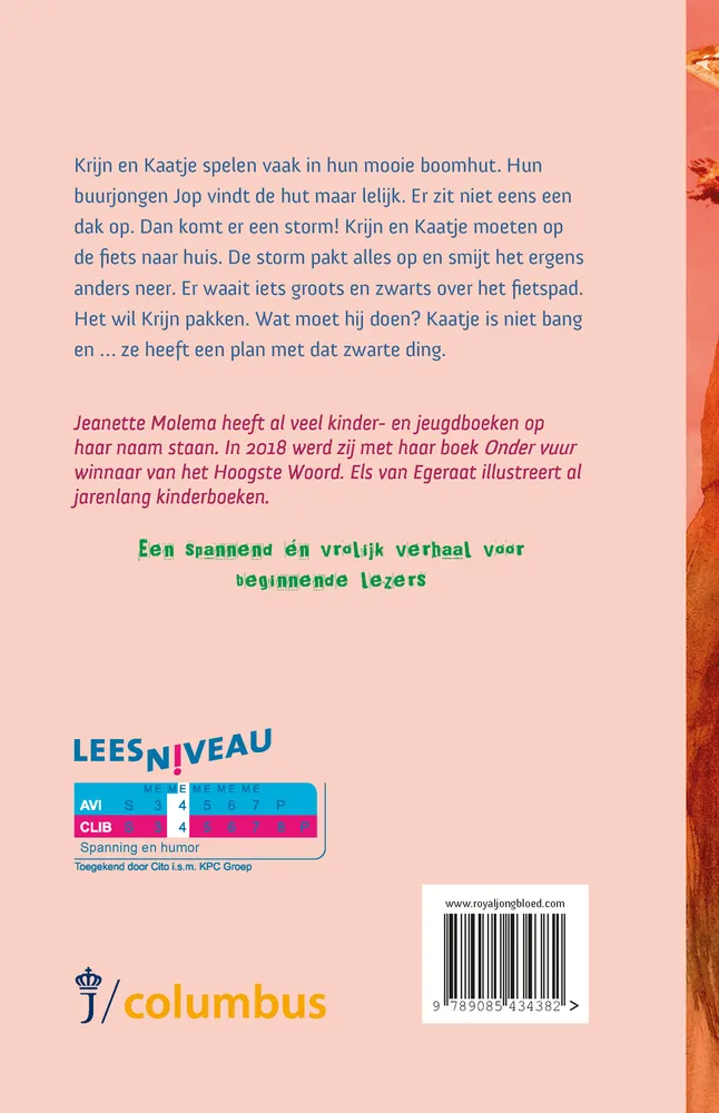 Krijn en Kaatje spelen vaak in hun mooie boomhut. Hun buurjongen Jop vindt de hut maar lelijk. Er zit niet eens een dak op. Dan komt er een storm! Krijn en Kaatje moeten op de fiets naar huis. De storm pakt alles op en smijt het ergens anders neer. Dan waait er iets groots en zwarts over het fietspad. Het wil Krijn pakken. Wat moet hij doen? Kaatje is niet bang en… ze heeft een plan met dat zwarte ding.