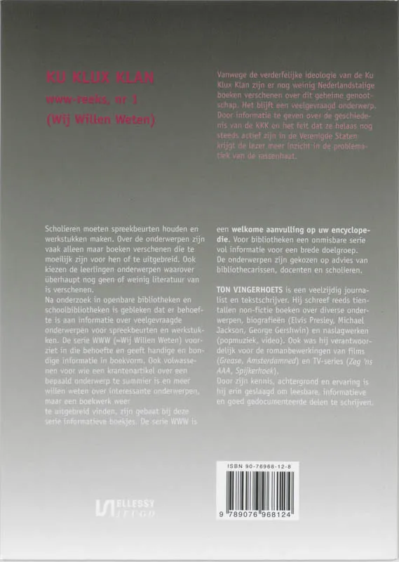 Vanwege de verderfelijke ideologie van de Ku Klux Klan zijn er nog weinig Nederlandstalige boeken verschenen over dit geheime genoot schap. Het blijft een veelgevraagd onderwerp, Door informatie te geven over de geschiede nis van de KKK en het feit dat ze helaas nog steeds actief aijn in de Verenigde Staten krijgt de lezer meer inzicht in de problema tiek van de massenhaal.