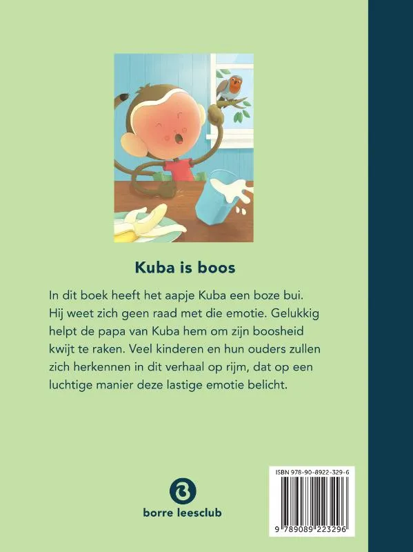 [vanaf 2 jaar] In dit boek heeft het aapje Kuba een boze bui. Hij weet zich geen raad met die emotie. Gelukkig helpt de papa van Kuba hem om zijn boosheid kwijt te raken. Veel kinderen en hun ouders zullen zich herkennen in dit verhaal op rijm, dat op een luchtige manier deze lastige emotie belicht.