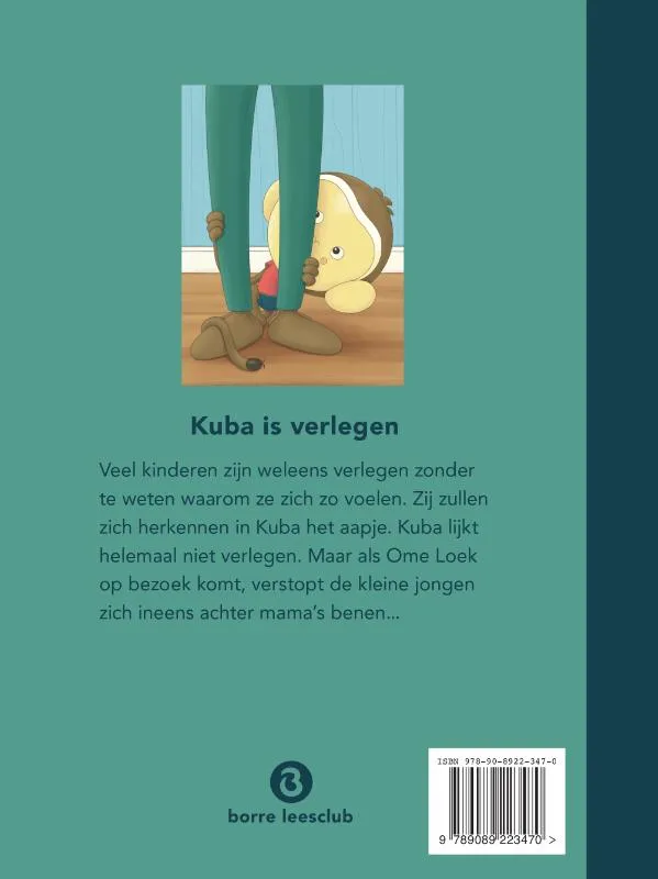 [vanaf 2 jaar] Veel kinderen zijn weleens verlegen zonder te weten waarom ze zich zo voelen. Zij zullen zich herkennen in Kuba het aapje. Kuba lijkt helemaal niet verlegen. Maar als Ome Loek op bezoek komt, verstopt de kleine jongen zich ineens achter mama’s benen…