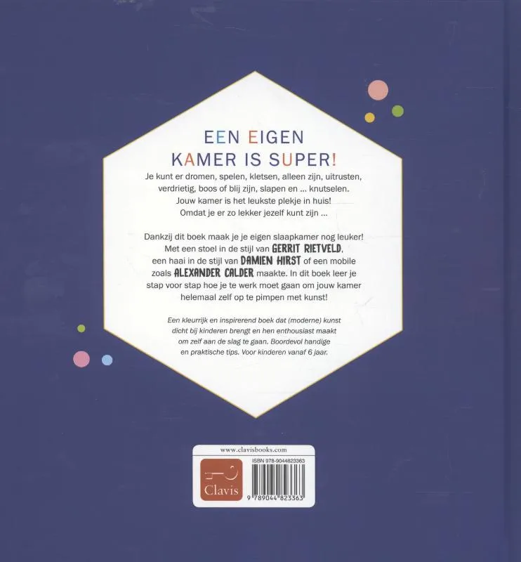 Dankzij dit boek maak je je eigen slaapkamer nog leuker! Maak een stoel in de stijl van Gerrit Rietveld, een haai in de stijl van Damien Hirst of een mobile zoals Alexander Calder maakte. In dit boek leer je stap voor stap hoe je te werk moet gaan om jouw kamer helemaal zelf op te pimpen met kunst!