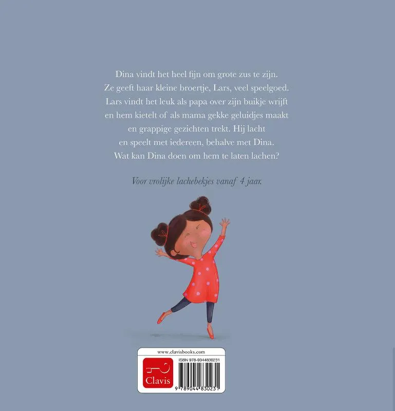Dina vindt het heel fijn om grote zus te zijn. Ze geeft haar kleine broertje, Lars, veel speelgoed. Lars vindt het leuk als papa over zijn buikje wrijft en hem kietelt of als mama gekke geluidjes maakt en grappige gezichten trekt. Hij lacht en speelt met iedereen, behalve met Dina. Wat kan Dina doen om hem te laten lachen?