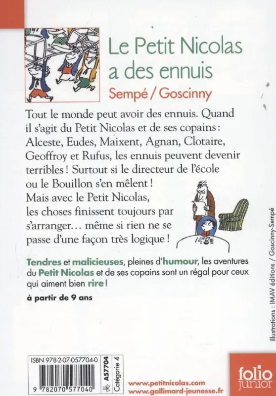 Tout le monde peut avoir des ennuis. Lorsqu’il s’agit du Petit Nicolas et de ses copains Alceste, Eudes, Maixent, Agnan, Clotaire, Geoffroy et Rufus, les ennuis peuvent devenir des catastrophes ! Surtout quand Papa, Mémé, M. Moucheboume, le patron de papa, le directeur de l’école, ou le Bouillon s’en mêlent ! Mais avec le Petit Nicolas, les choses finissent toujours par s’arranger… même si rien ne se passe vraiment de façon très logique !