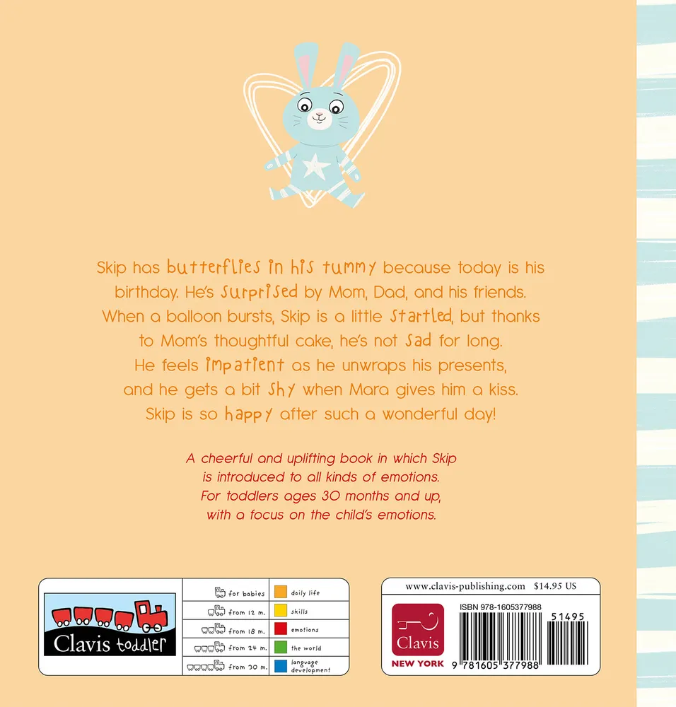Katertje Skip is jarig. Hij is teleurgesteld als hij niemand ziet. Als er een ballon knapt schrikt hij. Daar wordt hij verdrietig van. Zo krijgt Skip op zijn verjaardag met allerlei emoties te maken. Prentenboek met vriendelijke illustraties in zachte kleuren. Vanaf ca. 2,5 jaar.
