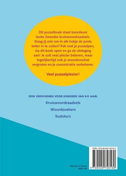 Dit puzzelboek staat boordevol leuke Zweedse kruiswoordraadsels voor kinderen van 8-9 jaar. Slaag jij erin om in elk hokje de juiste letter in te vullen? Pak snel je puzzelpen, sla dit boek open en ga de uitdaging aan! Je zult veel plezier beleven, maar tegelijkertijd ook je woordenschat vergroten en je concentratie verbeteren. Veel puzzelplezier! Ook verschenen voor kinderen van 8-9 jaar: Kruiswoordraadsels Woordzoekers Sudoku’s