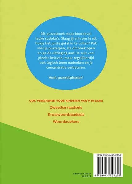 Dit puzzelboek staat boordevol leuke sudoku’s voor kinderen van 9-10 jaar. Slaag jij erin om in elk hokje het juiste getal in te vullen? Pak snel je puzzelpen, sla dit boek open en ga de uitdaging aan! Je zult veel plezier beleven, maar tegelijkertijd ook logisch leren nadenken en je concentratie verbeteren. Veel puzzelplezier! Ook verschenen voor kinderen van 9-10 jaar: Zweedse raadsels Kruiswoordraadsels Woordzoekers