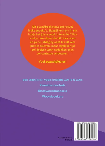 Dit puzzelboek staat boordevol leuke sudoku’s voor kinderen van 10-12 jaar. Slaag jij erin om in elk hokje het juiste getal in te vullen? Pak snel je puzzelpen, sla dit boek open en ga de uitdaging aan! Je zult veel plezier beleven, maar tegelijkertijd ook logisch leren nadenken en je concentratie verbeteren. Veel puzzelplezier! Ook verschenen voor kinderen van 10-12 jaar: Zweedse raadsels Kruiswoordraadsels Woordzoekers