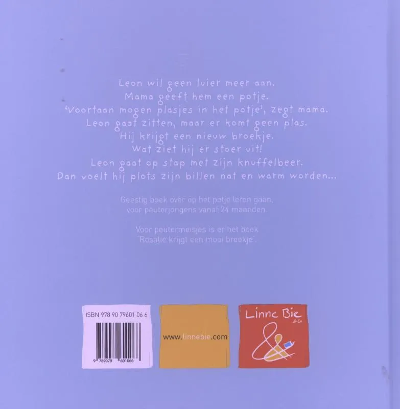 Leon wil geen kriebelende luier meer. Hij krijgt van mama een echte onderbroek. Dan heeft hij een klein ongelukje. Dat geeft niks, hij krijgt zelfs een stoere piratenbroek! Vierkant prentenboek met eenvoudige, vrolijk gekleurde tekeningen. Vanaf ca. 1,5 jaar.