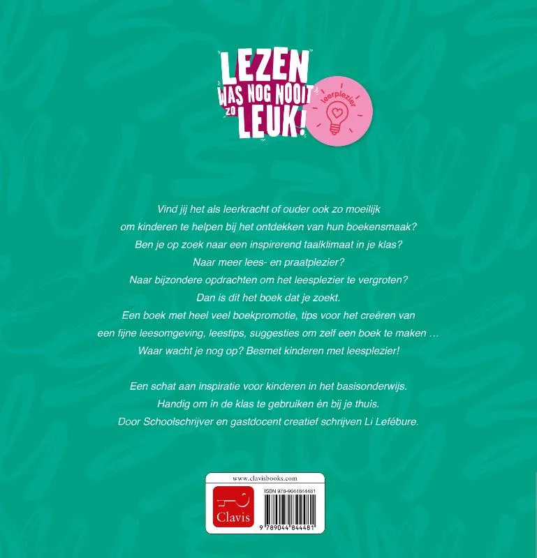 Vind jij het als leerkracht of ouder ook zo moeilijk om kinderen te helpen bij het ontdekken van hun boekensmaak? Ben je op zoek naar een inspirerend taalklimaat in je klas? Naar meer lees- en praatplezier? Naar bijzondere opdrachten om het leesplezier te vergroten? Dan is dit het boek dat je zoekt. Een boek met heel veel boekpromotie, tips voor het creëren van een fijne leesomgeving, leestips, suggesties om zelf een boek te maken… Waar wacht je nog op? Besmet kinderen met leesplezier!
