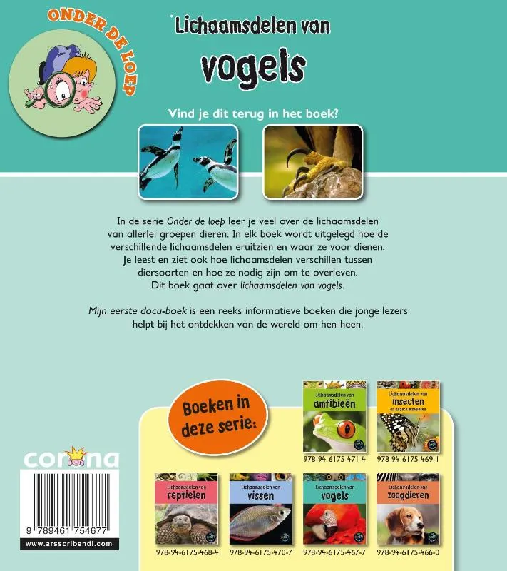 In de serie Onder de loep leer je veel over de lichaamsdelen van allerlei groepen dieren. In elk boek wordt uitgelegd hoe de verschillende lichaamsdelen eruitzien en waar ze voor dienen. Je leest en ziet ook hoe lichaamsdelen verschillen tussen diersoorten en hoe ze nodig zijn om te overleven. Dit boek gaat over lichaamsdelen van vogels.