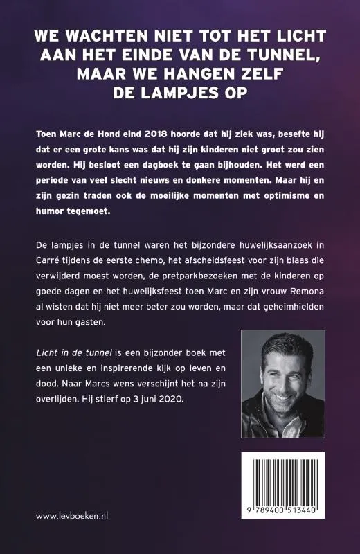 Licht in de tunnel is een bijzonder boek met een unieke en inspirerende kijk op leven en dood. Naar Marcs wens verschijnt het na zijn dood. Hij overleed op 3 juni 2020.