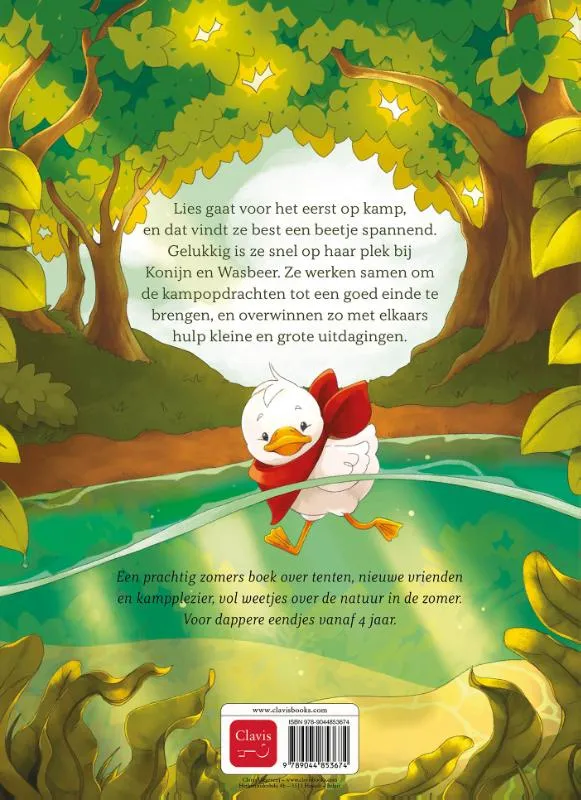 Lies gaat voor het eerst op kamp, en dat vindt ze best een beetje spannend. Gelukkig is ze snel haar op haar plek bij Konijn en Wasbeer. Ze werken samen om de kampopdrachten tot een goed einde te brengen, en overwinnen zo met elkaars hulp kleine en grote uitdagingen.Een prachtig zomers boek over tenten, nieuwe vrienden en kampplezier, vol weetjes over de natuur in de zomer. Voor dappere eendjes vanaf 4 jaar.
