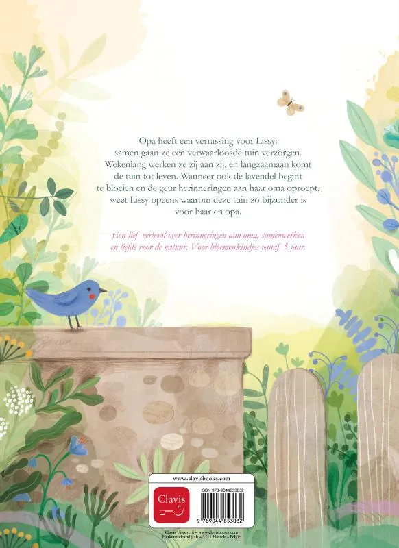 Opa heeft een verrassing voor Lissy: samen gaan ze een verwaarloosde tuin verzorgen. Wekenlang werken ze zij aan zij, en langzaamaan komt de tuin tot leven. Wanneer ook de lavendel begint te bloeien en de geur herinneringen aan haar oma oproept, weet Lissy opeens waarom deze tuin zo bijzonder is voor haar en opa.Een lief verhaal over herinneringen aan oma, samenwerken en liefde voor de natuur. Voor bloemenkindjes vanaf 5 jaar.