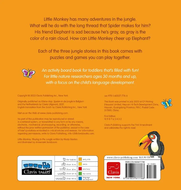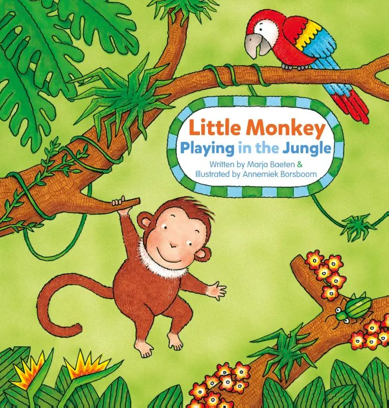 Drie verhalen over Elephant die verdrietig is omdat hij grijs is, Little Monkey die ’s nachts op avontuur gaat met Parrot en Spider die iets heel bijzonders kan. Vrijwel vierkant hardkartonnen prentenboek met vriendelijke, frisgekleurde tekeningen, tekst met pictogrammen, zoek- en aanwijsopdrachten en puzzels. Vanaf ca. 2,5 jaar.