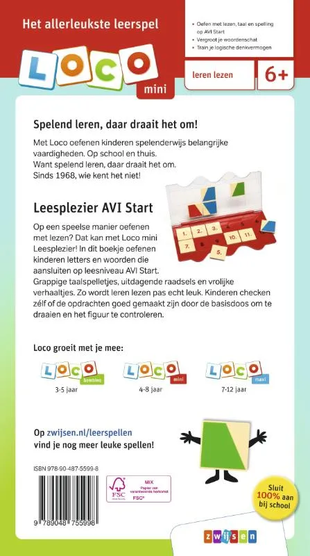 Op een speelse manier oefenen met lezen? Dat kan met Loco mini Leesplezier! In dit boekje oefenen kinderen letters en woorden die aansluiten op leesniveau AVI Start. Met welke puzzel gaat je kind als eerste aan de slag? Met de grappige taalspelletjes, vrolijke verhaaltjes of de uitdagende puzzels? Kinderen bepalen zelf welke opdrachten ze doen en kunnen ook zelf controleren of ze de opdrachten goed hebben gedaan door de doos om te draaien en het bolletjespatroon te controleren. Leren lezen is een feest met Loco mini Leesplezier! <br><br>Dit oefenboekje is te gebruiken bij de Loco mini basisdoos.<br><br>Leerdoelen: <br>•Oefen met lezen, taal en spelling op AVI Start<br>•Vergroot je woordenschat<br>•Train je logisch denkvermogen<br><br>Met het zelfcorrigerende Loco oefent je kind spelenderwijs belangrijke vaardigheden. Op school en thuis. Want spelend leren, daar draait het om. Sinds 1968, wie kent het niet!