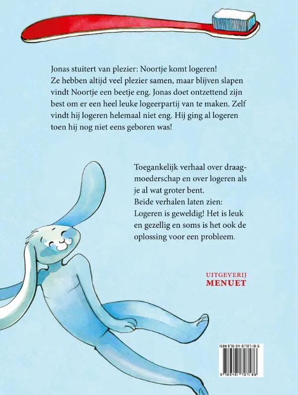 Ze hebben altijd veel plezier samen, maar blijven slapen vindt Noortje een beetje eng. Jonas doet ontzettend zijn best om er een heel leuke logeerpartij van te maken. Zelf vindt hij logeren helemaal niet eng. Hij ging al logeren toen hij nog niet eens geboren was!