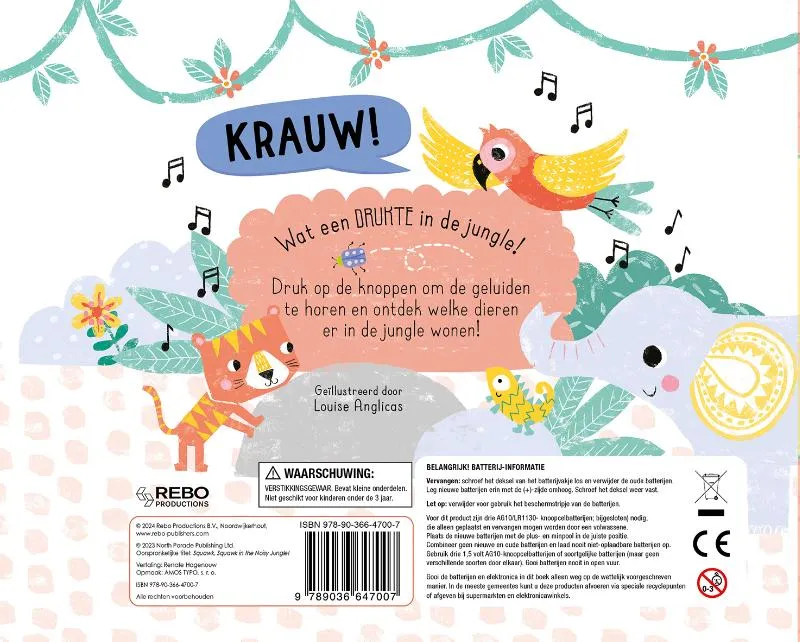 Grappig geluidenboek waarmee de allerkleinsten op speelse wijze kennis maken met allerlei soorten dieren in de jungle.