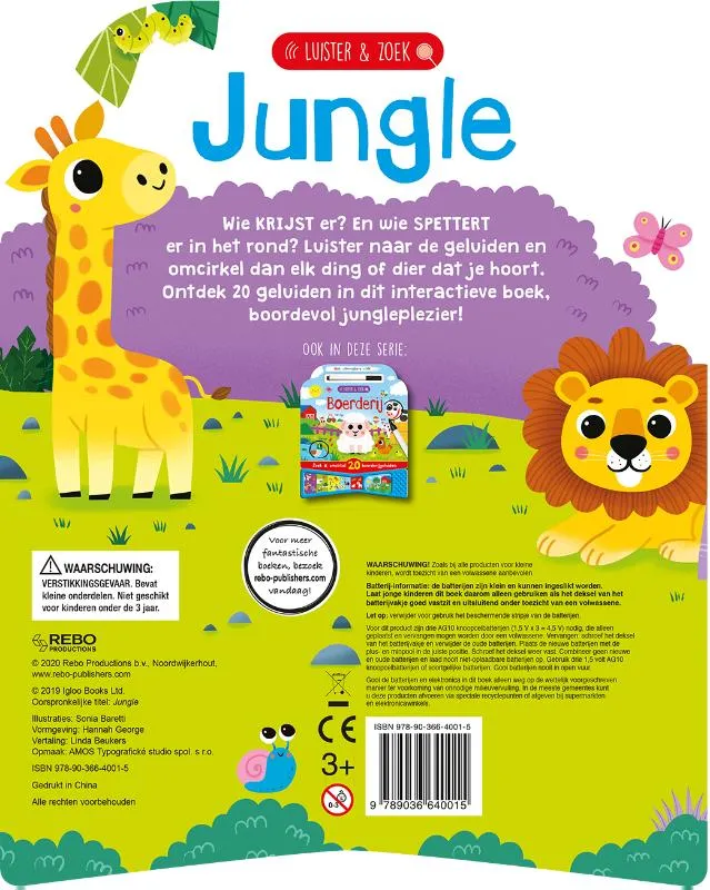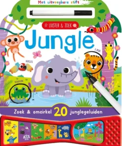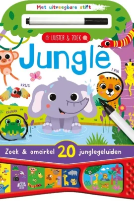 Wie KRIJST er? En wie SPETTERT er in het rond? Luister naar de geluiden en omcirkel dan elk ding of dier dat je hoort. Ontdek 20 geluiden in dit interactieve boek, boordevol jungleplezier!