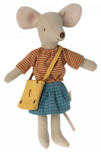 Deze moeder muis draagt een leuk gestreepte truitje, een geruite rok en een schoudertas ( de kleding kan aan- en uitgetrokken worden ).