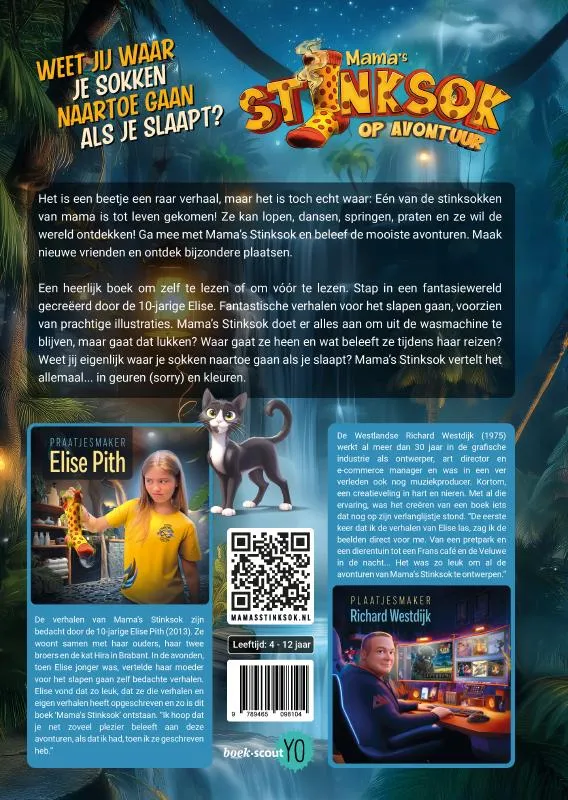 Een heerlijk boek om zelf te lezen of om vóór te lezen. Stap in een fantasiewereld gecreëerd door de 10-jarige Elise. Fantastische verhalen voor het slapen gaan, voorzien van prachtige illustraties. Mama’s Stinksok doet er alles aan om uit de wasmachine te blijven, maar gaat dat lukken? Waar gaat ze heen en wat beleeft ze tijdens haar reizen? Weet jij eigenlijk waar je sokken naartoe gaan als je slaapt? Mama’s Stinksok vertelt het allemaal… in geuren (sorry) en kleuren.