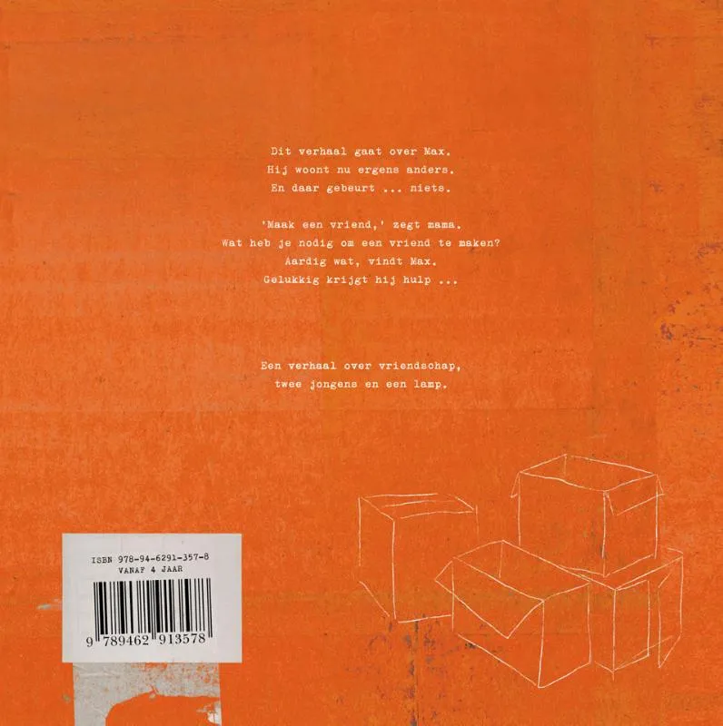 Max is net verhuisd. Al zijn speelgoed zit in dozen en mama heeft het veel te druk. ‘Ga naar buiten’, zegt ze. ‘Maak een vriend.’ Daar moet Max even over nadenken. Maak een vriend … Met een lampenkap, twee planken en een kleerhanger gaat hij aan de slag. De buurjongen komt over het hek loeren, maar voor hem heeft Max geen tijd. Hij wil zijn vriend afmaken!