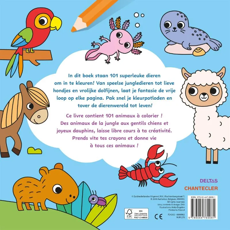 In dit boek staan 101 superleuke dieren om in te kleuren! Van speelse jungledieren tot lieve hondjes en vrolijke dolfijnen, laat je fantasie de vrije loop op elke pagina. Pak snel je kleurpotloden en tover de dierenwereld tot leven! Voor urenlang kleurplezier dankzij het grote formaat en het kwaliteitsvolle papier.