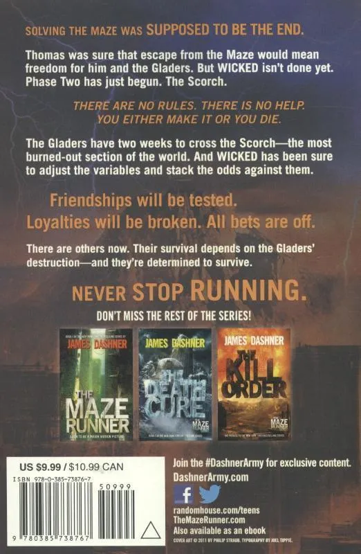 Book two in the blockbuster Maze Runner series that spawned a movie franchise and ushered in a worldwide phenomenon! And don’t miss The Fever Code, the highly-anticipated series conclusion that finally reveals the story of how the maze was built!<br> <br> Thomas was sure that escape from the Maze would mean freedom for him and the Gladers. But WICKED isn’t done yet. Phase Two has just begun. The Scorch.<br> The Gladers have two weeks to cross through the Scorch-the most burned-out section of the world. And WICKED has made sure to adjust the variables and stack the odds against them.<br> There are others now. Their survival depends on the Gladers’ destruction-and they’re determined to survive.<br> Friendships will be tested. Loyalties will be broken. All bets are off. <br><br> The Maze Runner and Maze Runner: The Scorch Trials, and Maze Runner: The Death Cure are all now major motion pictures featuring the star of MTV’s Teen Wolf, Dylan O’Brien; Kaya Scodelario; Aml Ameen; Will Poulter; and Thomas Brodie-Sangster.<br> <br> Also look for James Dashner’s edge-of-your-seat MORTALITY DOCTRINE series!<br> <br> Praise for the Maze Runner series:<br> A #1 New York Times Bestselling Series<br> A USA Today Bestseller<br> A Kirkus Reviews Best Teen Book of the Year<br> An ALA-YASLA Best Fiction for Young Adults Book<br> An ALA-YALSA Quick Pick<br> <br> “[A] mysterious survival saga that passionate fans describe as a fusion of Lord of the Flies, The Hunger Games, and Lost.” -EW.com<br> <br> “Wonderful action writing-fast-paced…but smart and well observed.” -Newsday<br> <br> “[A] nail-biting must-read.” -Seventeen.com<br> <br> “Breathless, cinematic action.” -Publishers Weekly<br> <br> “Heart pounding to the very last moment.” -Kirkus Reviews<br> <br> “Exclamation-worthy.” -Romantic Times<br> <br> “James Dashner’s illuminating prequel [The Kill Order] will thrill fans of this Maze Runner [series] and prove just as exciting for readers new to the series.” -Shelf Awareness, Starred<br><br> “Take a deep breath before you start any James Dashner book.” -Deseret News
