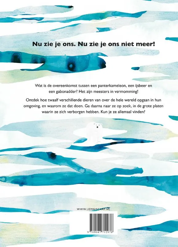 Een zoekboek recht uit de natuur Er zijn dieren die zich fantastisch kunnen vermommen. Sommige hebben schutkleuren of kunnen van kleur veranderen, waardoor ze niet opvallen in hun omgeving, andere doen zich zelfs voor als andere dieren of planten. Meesters in vermomming is een ode aan deze dieren. Eerst wordt uitgelegd hoe een bepaald dier zich weet te vermommen, gevolgd door een grote zoekplaat waarin je het betreffende dier moet ontdekken. Twaalf dieren komen aan bod, van de ijsbeer tot de orchideebidsprinkhaan en van kameleons tot mimische octopussen. Twaalf verbluffende verhalen en twaalf schitterende zoekplaten.