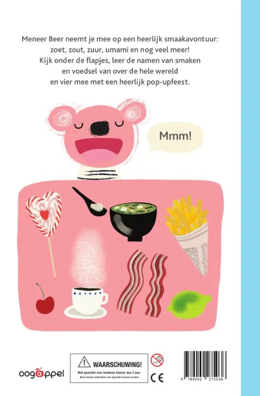 Zoet, zout, bitter, zuur… maar ook pittig, walgelijk, smaakloos… en zelfs de smaak van de kindertijd. Al deze smaken staan in Meneer Beer heeft honger, een zintuiglijk prentenboek om te leren hoe goed te eten.