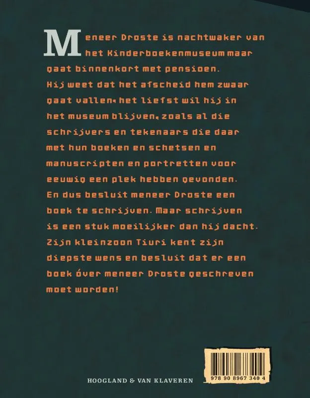 Meneer Droste is nachtwaker van het Kinderboekenmuseum maar gaat binnenkort met pensioen. Hij weet dat het afscheid hem zwaar gaat vallen het liefst wil hij in het museum blijven zoals al die schrijvers en tekenaars die daar met hun boeken en schetsen en manuscripten en portretten voor eeuwig een plek hebben gevonden. En dus besluit meneer Droste een boek te schrijven. Maar schrijven is een stuk moeilijker dan hij dacht. Zijn kleinzoon Tiuri kent zijn diepste wens en besluit dat er een boek over meneer Droste geschreven moet worden!