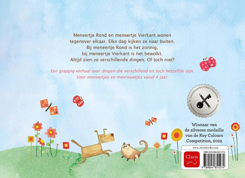 Meneertje Rond en meneertje Vierkant wonen tegenover elkaar. Elke dag kijken ze naar buiten. Bij meneertje Rond is het zonnig, bij meneertje Vierkant is het bewolkt. Altijd zien ze verschillende dingen. Of toch niet?