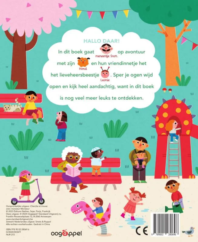 In dit boek gaat meneertje Snor op avontuur met zijn hond en hun vriendinnetje het het lieveheersbeestje. Sper je ogen wijd open en kijk heel aandachtig, want in dit boek is nog veel meer leuks te ontdekken.