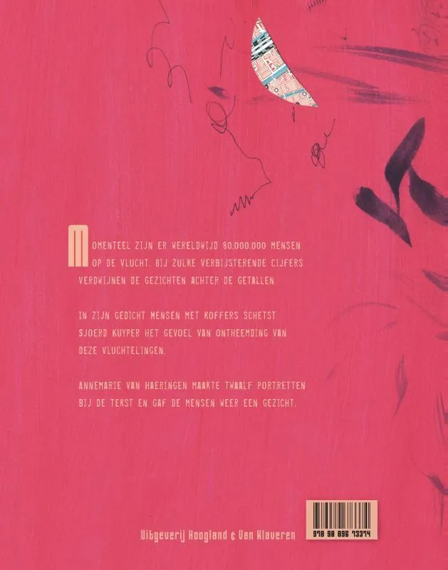Momenteel zijn er wereldwijd 80.000.000 mensen op de vlucht. Bij zulke verbijsterende cijfers verdwijnen de gezichten achter de getallen. In zijn gedicht ‘Mensen met koffers’ schetste Sjoerd Kuyper het gevoel van ontheemding van deze vluchtelingen. Annemarie van Haeringen maakte twaalf portretten bij de tekst en gaf de mensen weer een gezicht.