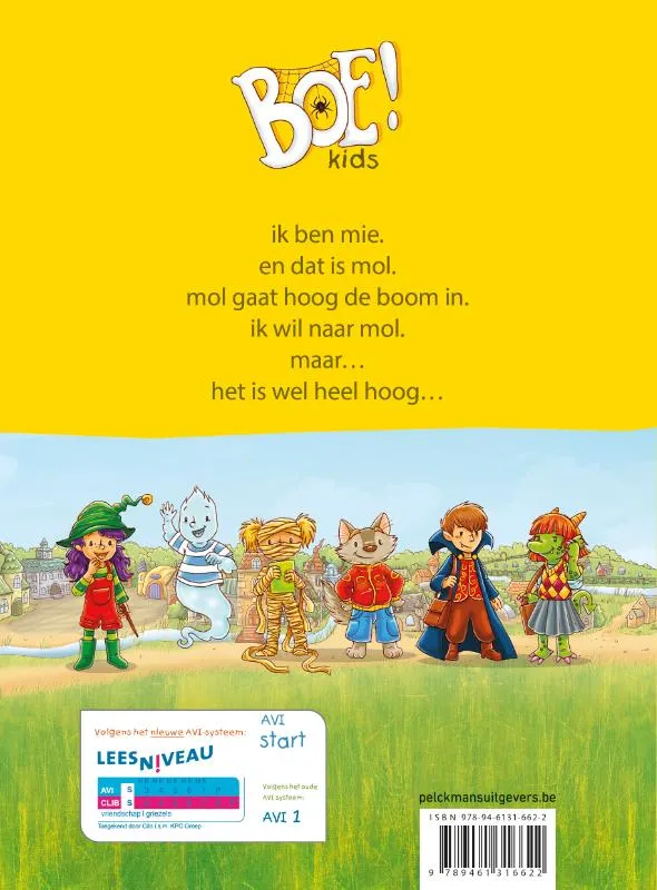 Mie heeft een kat. De kat heet Mol. Mol zit in de boom. Heel hoog. Mie wil naar Mol toe. Maar het is wel heel hoog. AVI-Start. Vanaf ca. 6 jaar.