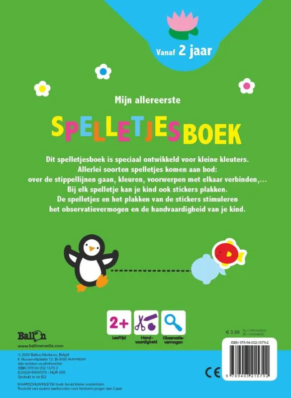 Dit spelletjesboek is speciaal ontwikkeld voor kleine kleuters vanaf twee jaar. Allerlei soorten spelletjes komen aan bod: over de stippellijnen gaan, kleuren, voorwerpen met elkaar verbinden,… Bij elk spelletje kan je kind ook stickers plakken. De spelletjes en het plakken van de herbruikbare stickers stimuleren het observatievermogen en de handvaardigheid van je kind.