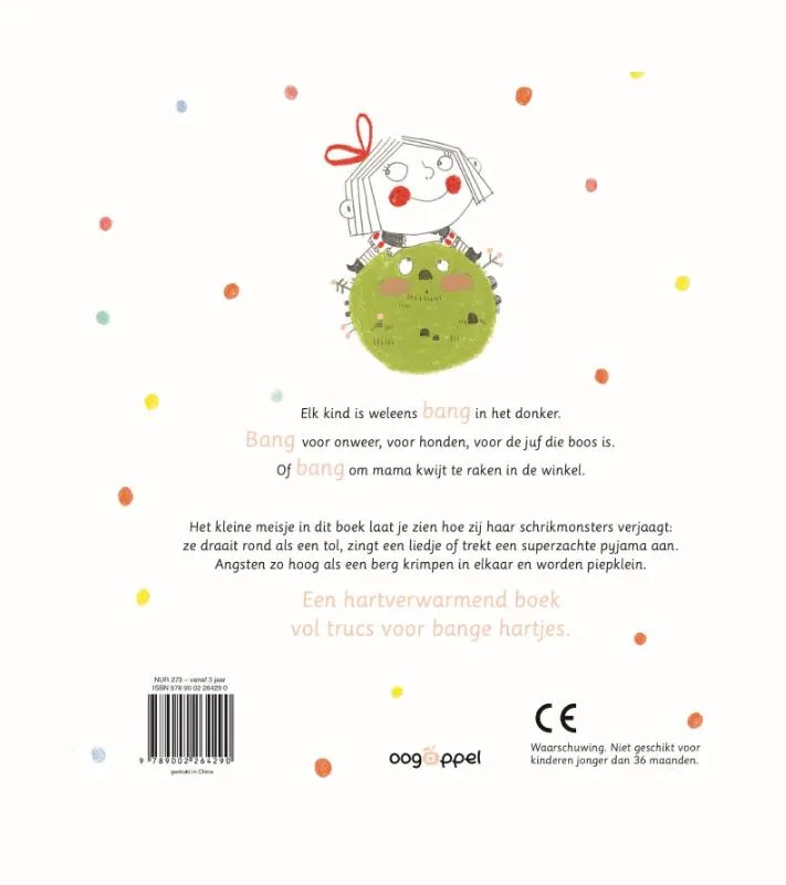 Elk kind is weleens bang in het donker. Bang voor onweer, voor honden, voor de juf die boos is. Of bang om mama kwijt te raken in de winkel. Het kleine meisje in dit boek laat je zien hoe zij haar schrikmonsters verjaagt: ze draait rond als een tol, zingt een liedje of trekt een superzachte pyjama aan. Angsten zo hoog als een berg krimpen in elkaar en worden piepklein. Een hartverwarmend boek vol trucs voor bange hartjes.