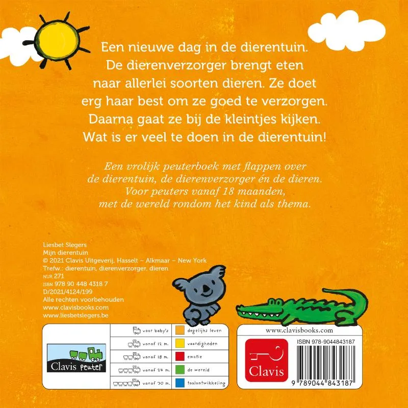 Een vrolijk peuterboek met flappen over de dierentuin, de dierenverzorger én de dieren. Voor peuters vanaf 18 maanden, met de wereld rondom het kind als thema.