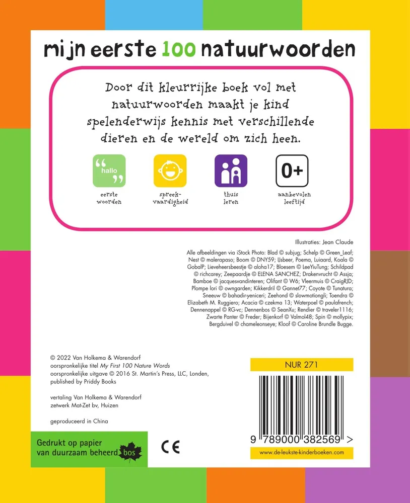 Met mijn eerste 100 natuurwoorden vol natuurwoorden maakt je kind kennis met verschillende dieren zoals de panda, leeuw en zebra en de wereld om zich heen. Van planten en dieren, tot landschappen en het weer. De vrolijke afbeeldingen staan garant voor kijk- en leerplezier. De padded cover en afgeronde hoeken maken dit boek extra geschikt voor kleine kinderhanden.