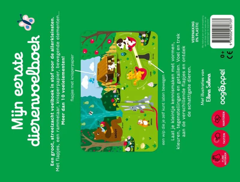 Een groot, streelzacht voelboek in stof voor de allerkleinsten. Met flapjes, een rammelaar, knisperpapier, bewegende elementen zoals een wip die je zelf kan laten bewegen… Laat je kleintje kennismaken met vormen, kleuren, tegenstellingen en getallen. Voel en trek aan de verschillende flapjes en ontdek de schattigste dieren van het bos.