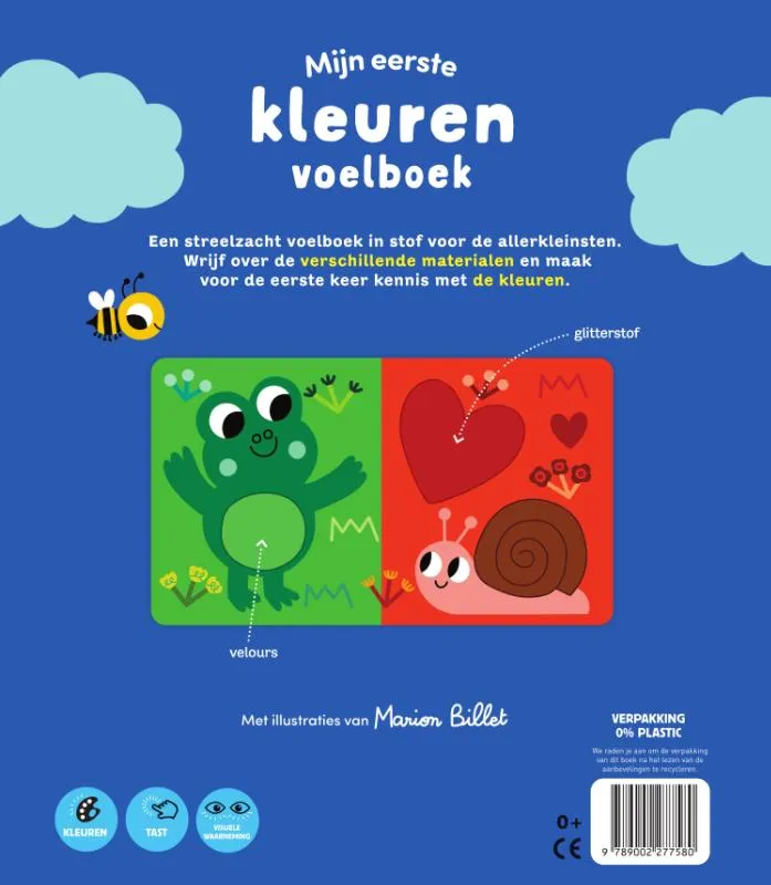 Een streelzacht voelboek in stof voor de allerkleinsten. Wrijf over de verschillende materialen en maak voor de eerste keer kennis met de kleuren.