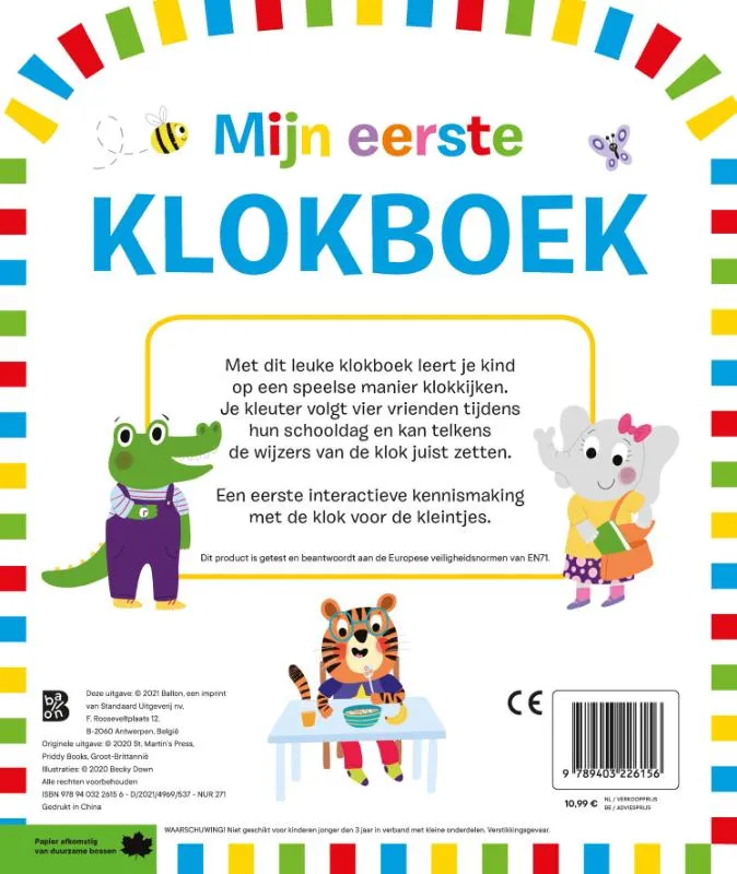 Met dit leuke klokboek leert je kind op een speelse manier klokkijken. Je kleuter volgt vier vrienden tijdens hun schooldag en kan telkens de wijzers van de klok juist zetten. Een eerste interactieve kennismaking met de klok voor de kleintjes.