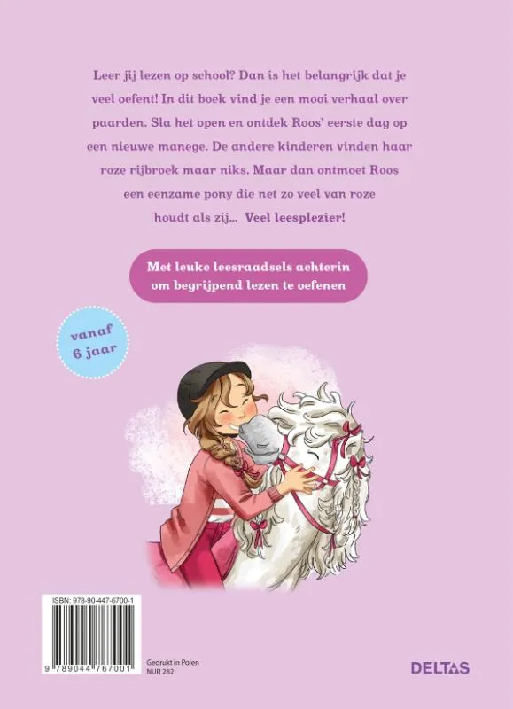 Dit leuke leesboek is voor kinderen vanaf 6 jaar die leren lezen en veel willen oefenen. Binnenin staat een mooi verhaal over paarden, dat dankzij de korte woorden en eenvoudige zinnen heel geschikt is voor beginnende lezers. Achterin werden enkele leuke raadsels toegevoegd om begrijpend lezen te oefenen. In het boek ga je met Roos mee op haar eerste dag bij een nieuwe manege. De andere kinderen vinden haar roze rijbroek maar niks. Maar dan ontmoet Roos een eenzame pony die net zo veel van roze houdt als zij… Leesplezier verzekerd!