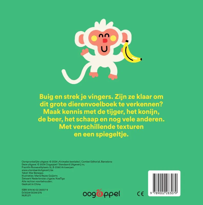 Buig en strek je vingers. Zijn ze klaar om dit grote dierenvoelboek te verkennen?Maak kennis met de tijger, het konijn, de beer, het schaap en nog vele anderen.Met verschillende texturen en een spiegeltje.