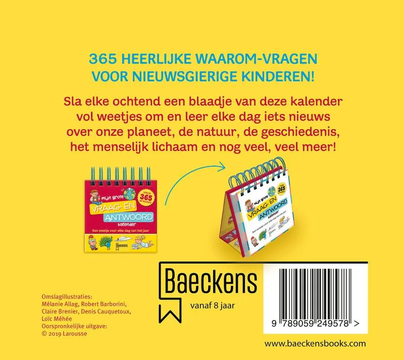 Deze kalender telt 365 heerlijke waarom-vragen voor nieuwsgierige kinderen. Sla elke ochtend een blaadje van deze kalender vol weetjes om en leer elke dag iets nieuws over onze planeet, de natuur, de geschiedenis, het menselijk lichaam en nog veel, veel meer!