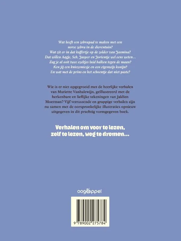 Wat heeft een zebrapad te maken met een norse zebra in de dierentuin? Wat zit er in dat koffertje op de zolder van Jasmina? Dat willen Aagje, Seb, Jasper en Jorientje wel eens weten… Zag je al ooit twee ezeltjes luid balken tegen de maan? Ken jij een kniezemiesje en een eigenwijs konijn? En wat met de prins en het schoentje dat niet paste? Wie is er niet opgegroeid met de heerlijke verhalen van Mariette Vanhalewijn, geïllustreerd met de herkenbare en lieflijke tekeningen van Jaklien Moerman? Vijf verrassende en grappige verhalen zijn nu samen met de oorspronkelijke illustraties opnieuw uitgegeven in dit prachtig vormgegeven boek.