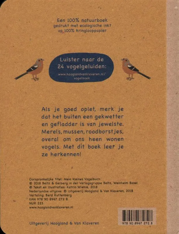 Maak kennis met 24 vogels en hun leefomgeving: tuin, weiland en bos. Prentenboek van hergebruikt karton met eenvoudige illustraties in natuurlijke kleuren. Vogelgeluiden zijn via een website te beluisteren. Vanaf ca. 4 jaar.
