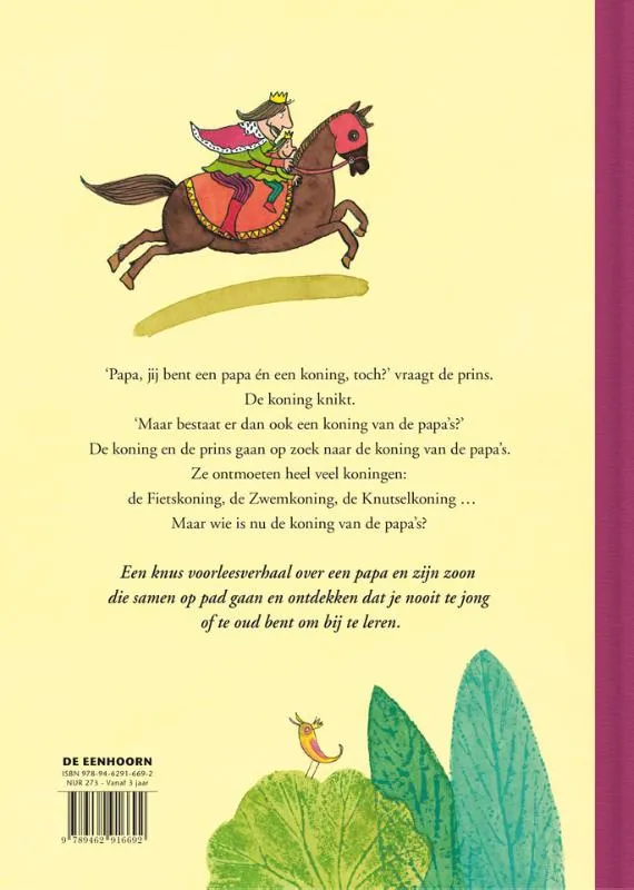 De prins gaat met zijn papa op zoek naar de koning van de papa’s. Onderweg komen ze de Fietsenkoning tegen, die niet de koning van de papa’s is, maar hen wel kan leren fietsen. Ook de Knutselkoning, de Zwemkoning, de Smulkoning en de Droomkoning hebben hun talenten. Papa steekt er veel van op. Wie zou nu de koning van de papa’s kunnen zijn?