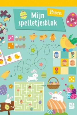 In dit spelletjesblok zitten tal van leuke paasspelletjes: vind het paasei dat maar één keer voorkomt, zoek de juiste schaduw van de paashaas, verbind de twee kuikentjes die hetzelfde zijn, en nog veel meer.